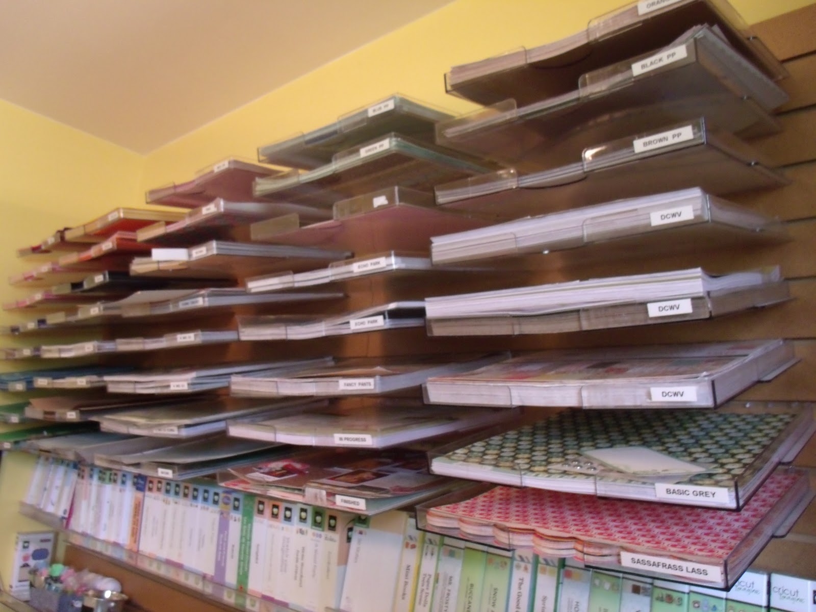 My 7 foot desk used to be brown, but I sanded and painted it to match. (And am pretty proud of myself for how it came out!). Can you believe those paper trays? We got them for a steal from a scrapbook store that closed down. I love looking like a store. LOL And yes, those are a lot of cricut carts. I have gotten a lot as gifts...and the others on sale.